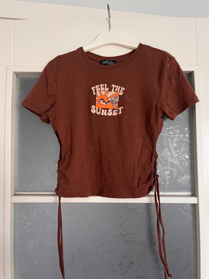 Kısa Kollu Kahverengi Baskılı Yanları İpli Crop Tişört