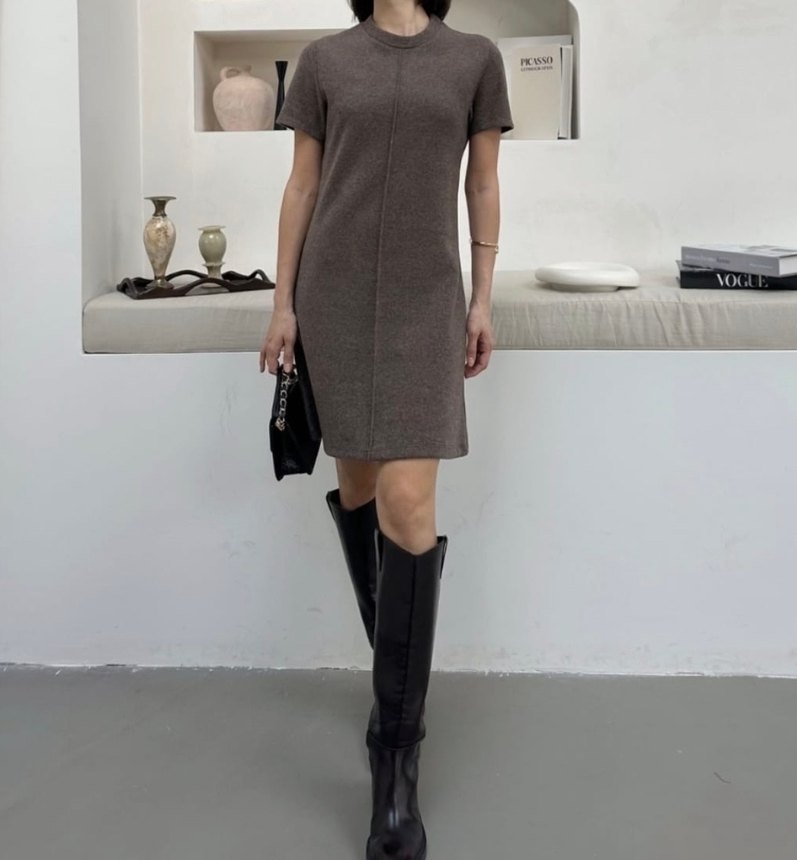 Kahverengi , kısa kollu, yuvarlak yakalı ve midi uzunlukta triko elbise. Günlük kullanıma uygun, sade ve şık bir tasarım. Bedenleri ve Bordo,Siyah,Gri renkleri mevcuttur