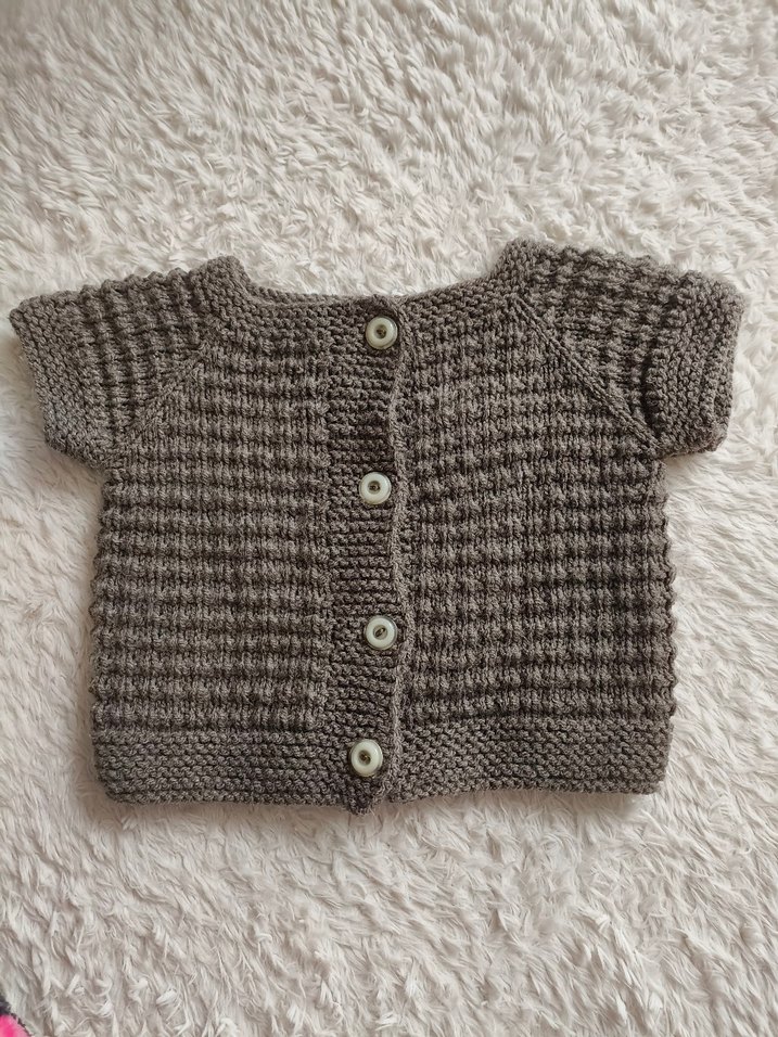 Kısa kollu, kahverengi örgü hırka, yuvarlak yaka ve bol kesime sahiptir. Düğmeli ön kısmı ve kısa boyu ile rahat bir günlük stil sunar. el örgüsüdür istenilen yaşta örülebilir bu model 0-1 yaş için uygundur hem kız hem erkek bebek içindir