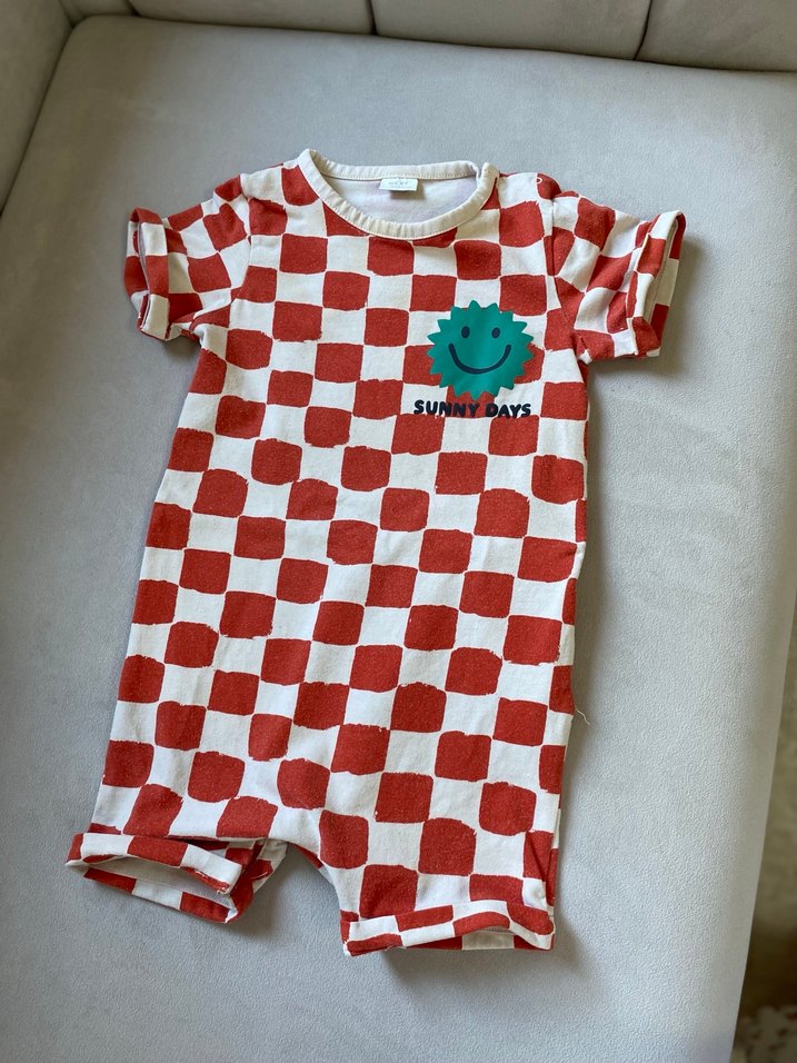 Renkli kareli desenli, kısa kollu ve yuvarlak yakalı pamuklu bebek tulumu. Kolay giydirme için düğmeli ve üzerinde yeşil güneş grafik ve 'Sunny Days' yazısı bulunur. ☀️