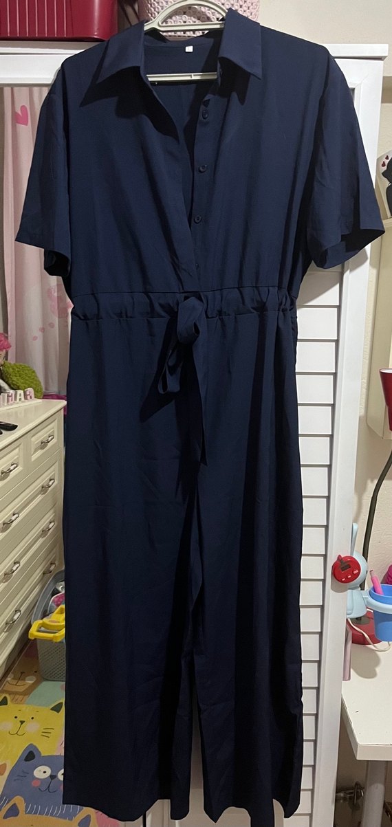 Kadınlar için kısa kollu, düğmeli ve kemerli bel detaylı lacivert uzun tulum. Sentetik kumaştan, rahat kesimli ve minimal desen içermeyen şık bir modeldir.