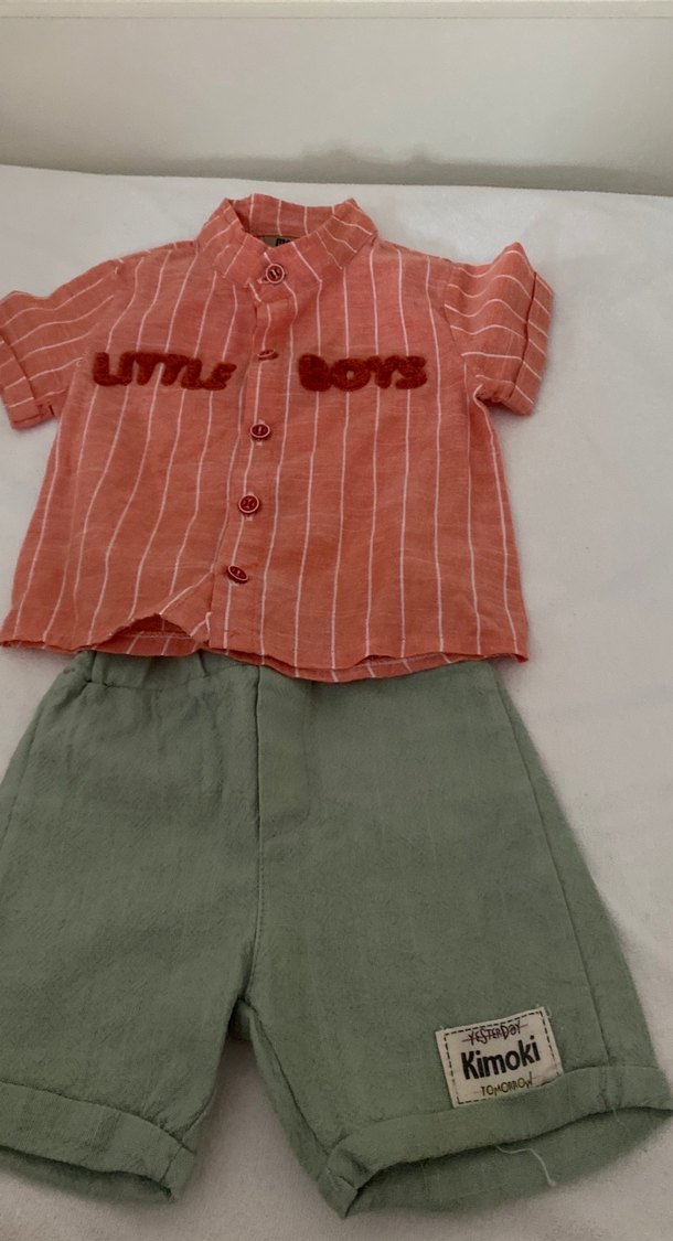 Keten kumaştan, kısa kollu ve düğmeli pastel kırmızı gömlek, yakasında notched lapel detayı ve 'Little Boys' yazısı bulunur. Açık yeşil şort ile tamamlanır.