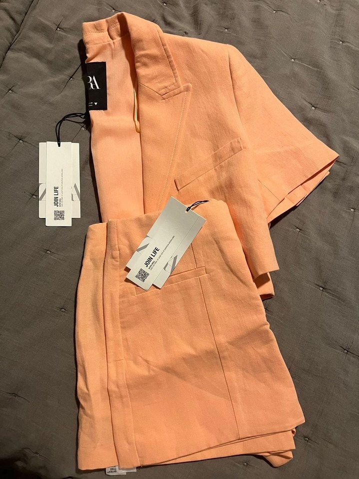 Kısa kollu, çentikli yaka blazer ve mini boy şortlardan oluşan somon keten kadın takım elbise. Rahat kesim, günlük iş kullanımı için şık ve rahat.