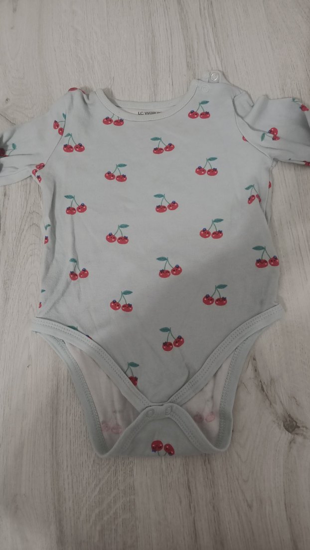 Beyaz, pastel kiraz desenli, kısa kollu, yuvarlak yakalı, düğmeli bebek body.