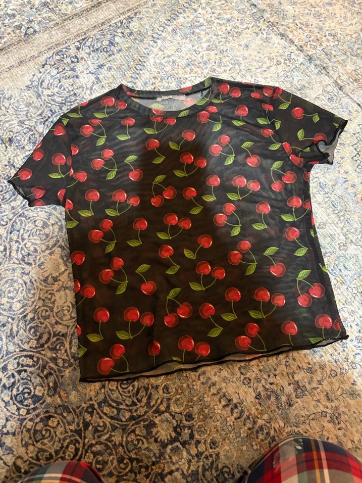 Sentetik kumaştan, kiraz baskılı, kısa kollu, salaş kesim, yuvarlak yakalı kadın tişörtü.