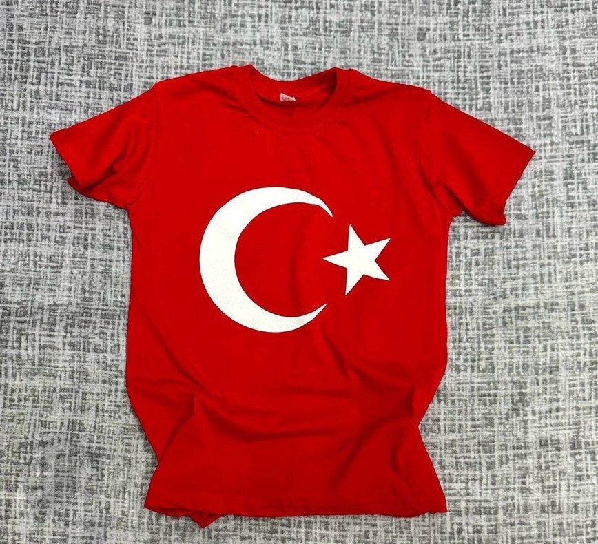Kısa kollu, normal boyda, beyaz ay yıldız baskılı kırmızı, fit kesim tişört. Yumuşak kumaştan, günlük kullanıma uygun.