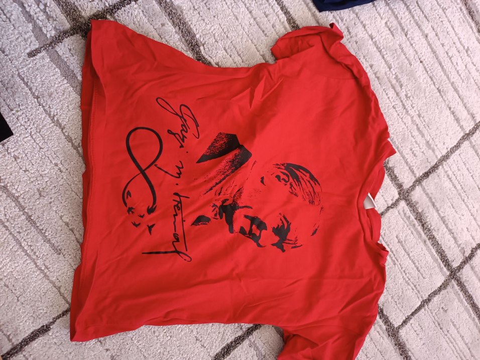 Kısa kollu, , ipeksi ve parlak kırmızı kumaştan. Yuvarlak yaka ve baskılı desenli, günlük sokak stiline uygun. Gazi Mustafa Kemal Atatürk yazılı tişört