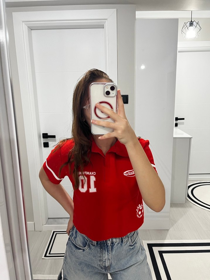 Kısa kollu, bisiklet yaka ve baskılı detaylara sahip kırmızı crop tişört. Yumuşak ve sıcak kumaştan üretilmiş, rahat ve şık bir görünüm sunar.