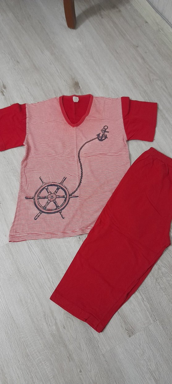 Renkli kırmızı kısa kollu, V yakalı, deniz temalı baskılı, bol kesim kadın pijama takımı. kadin s beden