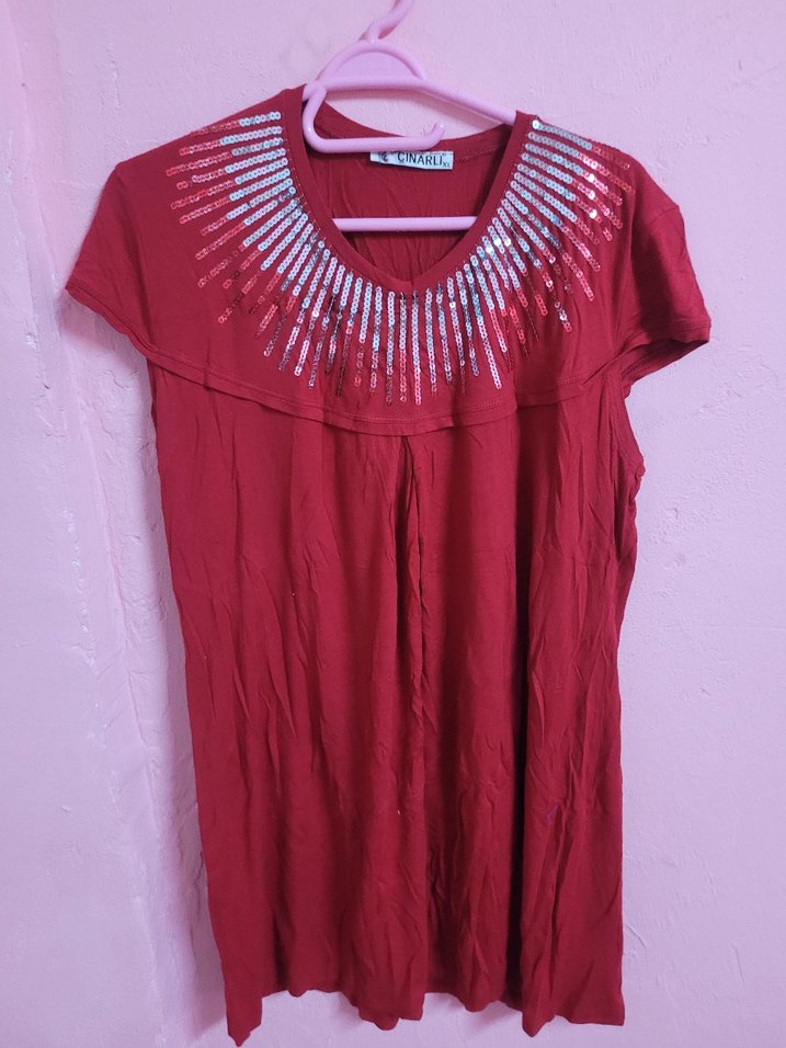 Kısa kollu, V yakalı kırmızı tunik, pile detaylıdır. Rahat kesim ve midi boyda, yumuşak dokulu renkli batik desenlidir. Bohem tarzda rahat bir seçimdir.