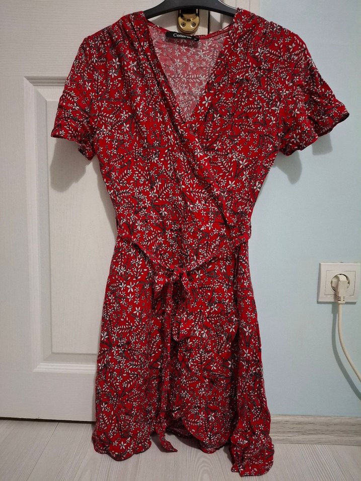 Kısa kollu, V yakalı ve bol kesimli kırmızı bohem midi elbise. Drapeli ve batik desenlidir, sentetik kumaştan üretilmiştir. Günlük kullanıma uygundur.