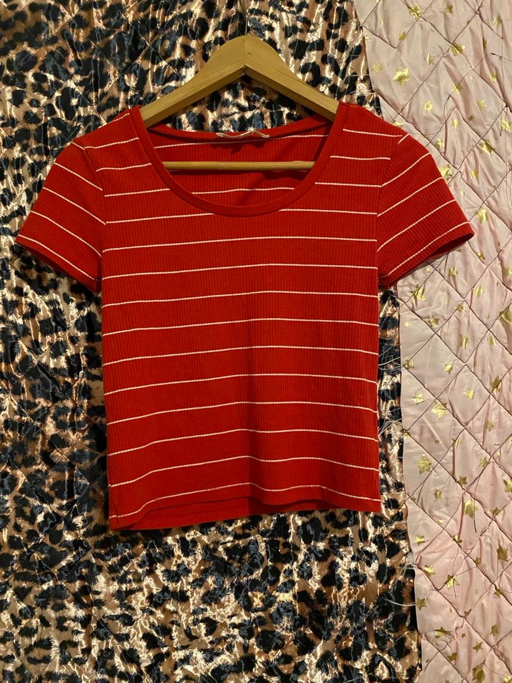Kısa kollu, tekne yaka, kırmızı üzerine beyaz çizgili, yumuşak kumaştan yapılmış, günlük rahat kullanıma uygun kadın tişörtü.