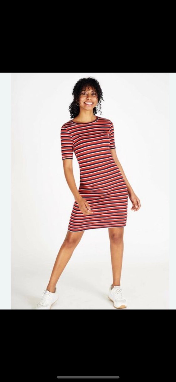 Likralı kumaştan yapılmış, kısa kollu ve bisiklet yakalı, kırmızı çizgili, vücuda oturan midi elbise. Günlük kullanıma uygun, rahat ve şık görünümlü.
