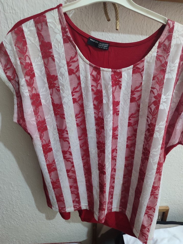 Kısa kollu, yuvarlak yakalı ve bol kesim kadın bluz. Parlak kırmızı ve beyaz dantel desenli, normal boyda, günlük sokak stili için uygun.