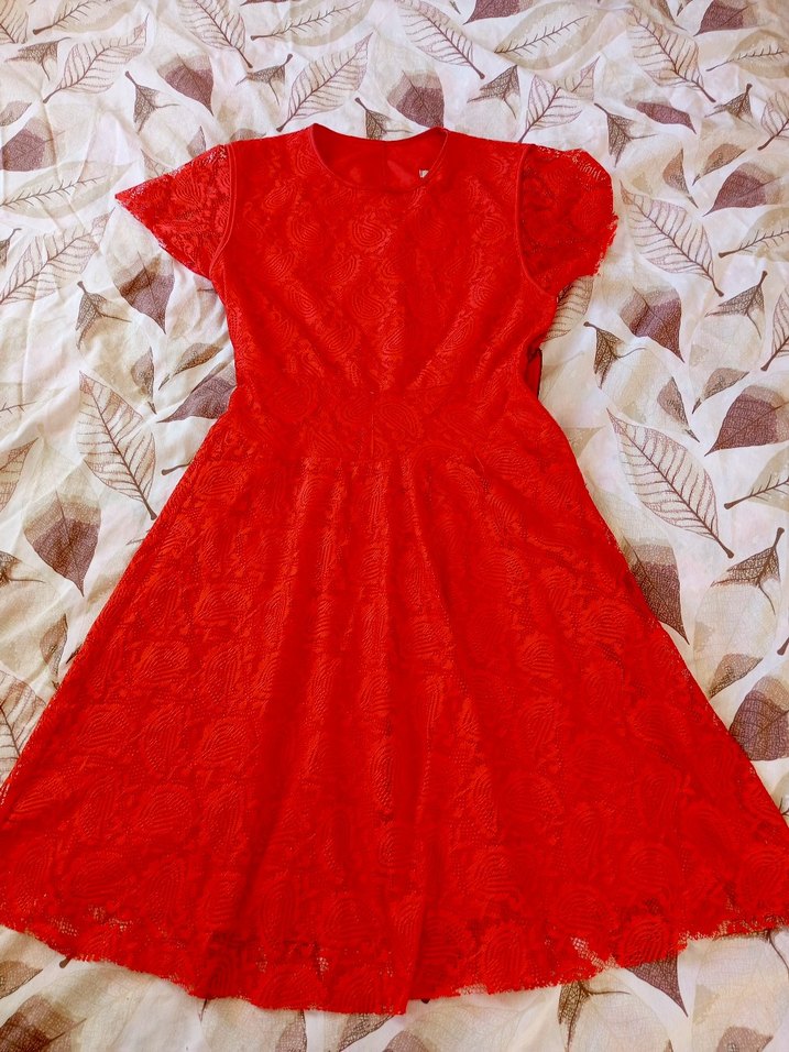 Kısa kollu, V yakalı kırmızı dantel elbise, vintage bohem tarzda ve düğünler için uygun, beden oturan kesimdedir.