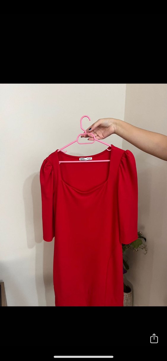 Kırmızı, kısa kollu, drapeli ve baskılı desenli, midi boyda, dar kesim elbise .