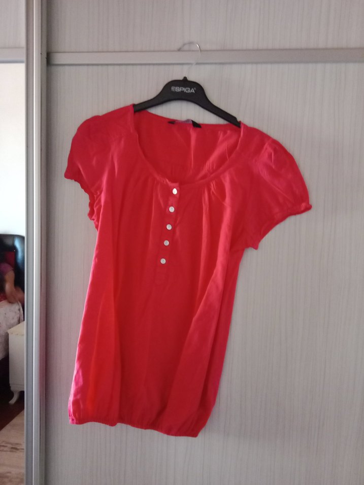 Kısa kollu, yuvarlak yakalı ve düğmeli kırmızı bluz. Nefes alabilen keten kumaştan, bol kesim ve midi boyda, günlük rahat kullanım için uygun.