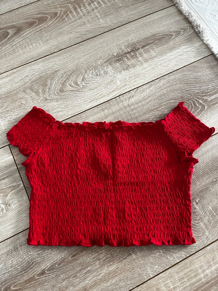 Keten kumaştan, kısa kollu ve fırfırlı detaylara sahip kırmızı, kısa boy, dar kesim bluz. Rahat ve günlük sokak stili için uygundur.
