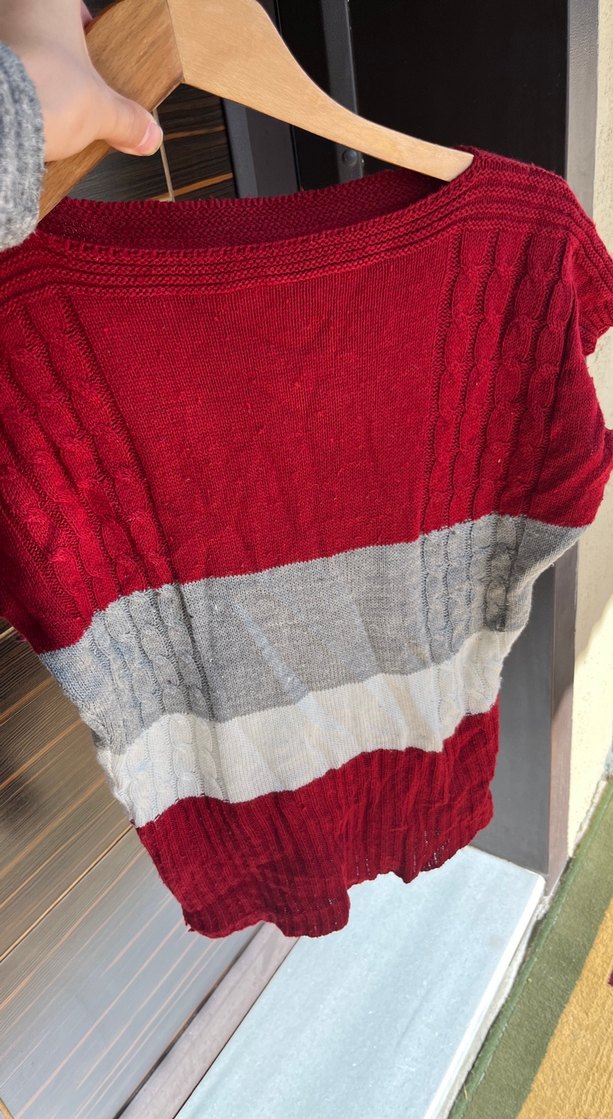 Kırmızı, gri ve beyaz renk bloklu, kısa kollu ve yuvarlak yakalı örgü kadın kazak. Vücuda oturan, kısa boy ve rahat bohem tarzda.