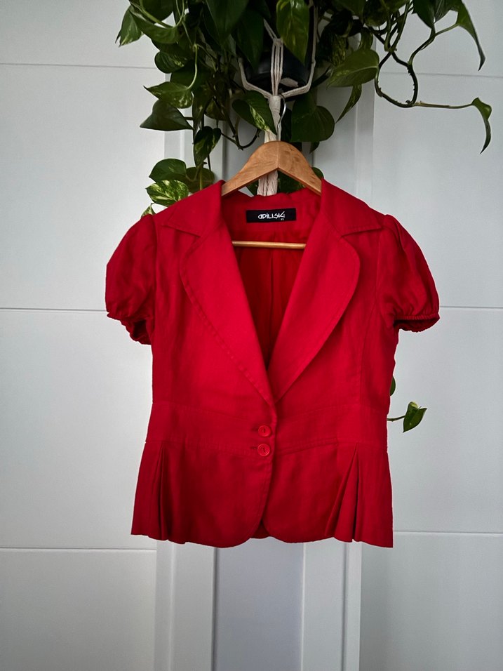 Keten kumaştan yapılmış, kısa kollu ve düğmeli kırmızı blazer. Klasik kesim ve kesik yakalı, ofis ve günlük kullanıma uygun.