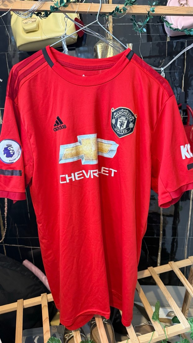 Dar kesim kısa kollu Manchester United forması, koyu kırmızı renk, bisiklet yaka ve baskılı Chevrolet ile Adidas logoları, kol kısmında cırt cırt detaylı ⚽