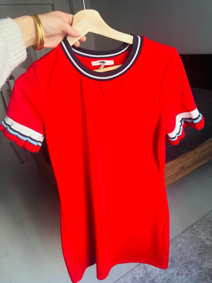 Kısa kollu, kırmızı midi elbise. Kollarında fırfır detayları ve yuvarlak yaka bulunur. Renkli baskılı ve rahat bir tasarıma sahiptir. Her bedene uyumludur ben 36 bedenim cok rahat giyebiliyorum bol durmuyor
