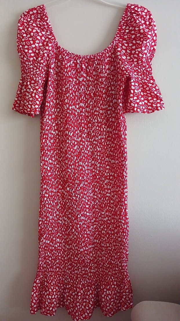 M-L beden fakat lastikli oldugu için S bedene de oluyor.Kısa kollu, volan detaylı, midi ve dar kesim elbise. Tekne yaka ve renkli kırmızı batik desenli, sentetik dokulu kumaştan üretilmiştir.
