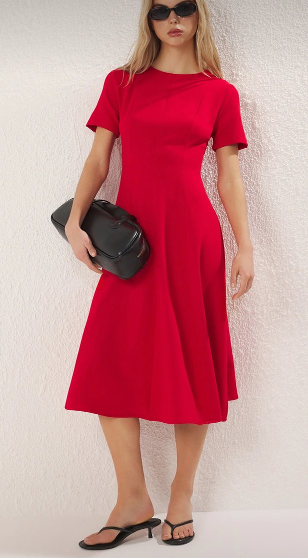Kırmızı midi elbise, kısa kollu ve yuvarlak yakalıdır. Etiketi mevcuttur hiç giyilmedi
