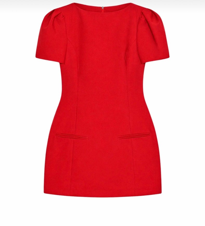 Kısa kollu, yuvarlak yaka kırmızı midi elbise, düğme detaylı ve vücuda oturan kesime sahiptir. Parlak sentetik kumaştan, ofis için modern klasik tarzda.