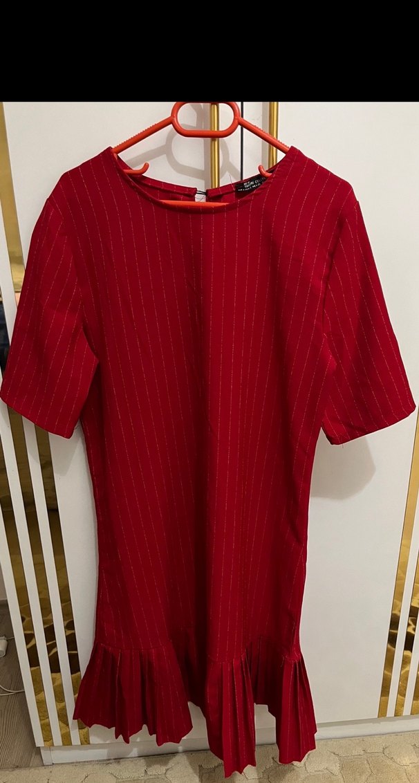 Kısa kollu, yuvarlak yakalı kırmızı midi elbise. Sentetik parlak kumaştan, bol kesim ve pile detaylı, ofis için uygun. S ve M beden uyumlu