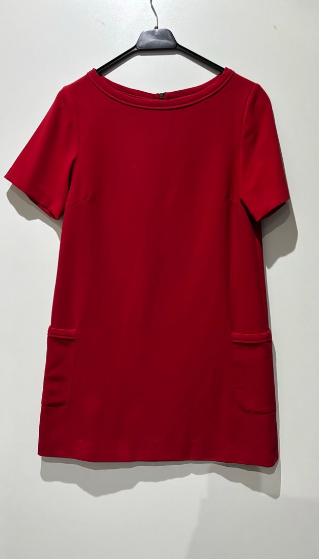 Kısa kollu, bisiklet yaka kırmızı midi triko elbise, rahat kesim ve yumuşak kumaştan üretilmiştir. Minimalist ve renkli tasarımıyla günlük kullanıma uygundur.