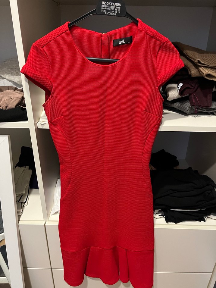 Kısa kollu, bisiklet yaka ve pilili etek uçlu kırmızı triko elbise. Midi boyda, sentetik kumaştan, ofis için uygun.