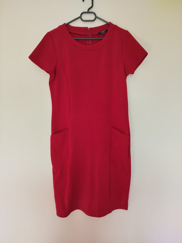 Kısa kollu, bisiklet yakalı ve vücuda oturan kırmızı triko elbise. Midi boy, yan cepli ve minimalist tarzda, ofis için uygun rahat bir tasarım.