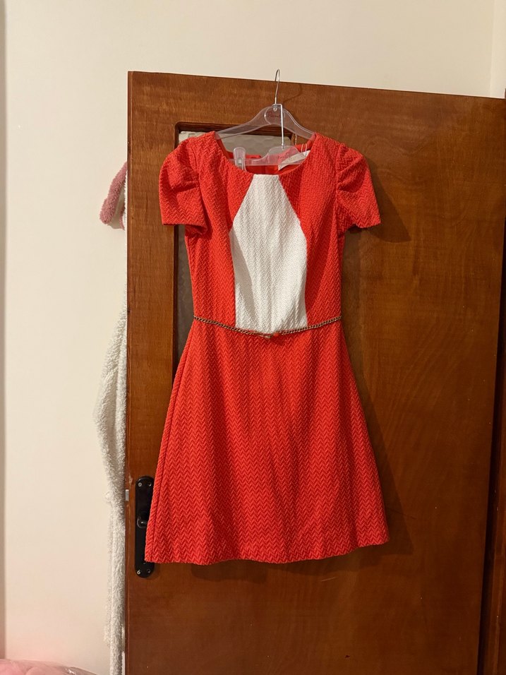 Kısa kollu, V yaka, kemerli ve dar kesim mini elbise. Sentetik kumaştan, modern klasik tarzda, günlük kullanıma uygun canlı kırmızı renkte.