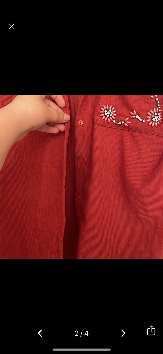 Kısa kollu, normal uzunlukta, yakası kırmalı ve düğmeli bu kırmızı gömlek dokulu kumaş ve nakışlı çiçek desenleriyle bohem tarzını yansıtır.