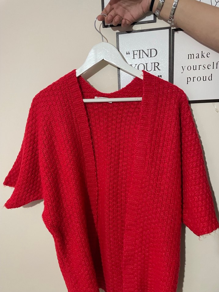 Kısa kollu, bol kesim kırmızı örgü kadın hırka, bohem ve rahat stil için uygundur.