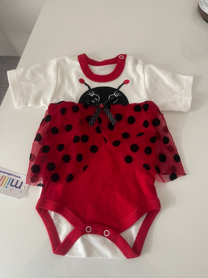 Kısa kollu, yuvarlak yakalı bebek body, renkli uğur böceği baskısı ve dantel detaylarıyla. Kırmızı ve beyaz renklerde eğlenceli bir tasarım. Etiketi üzerinde hiç giyilmedi