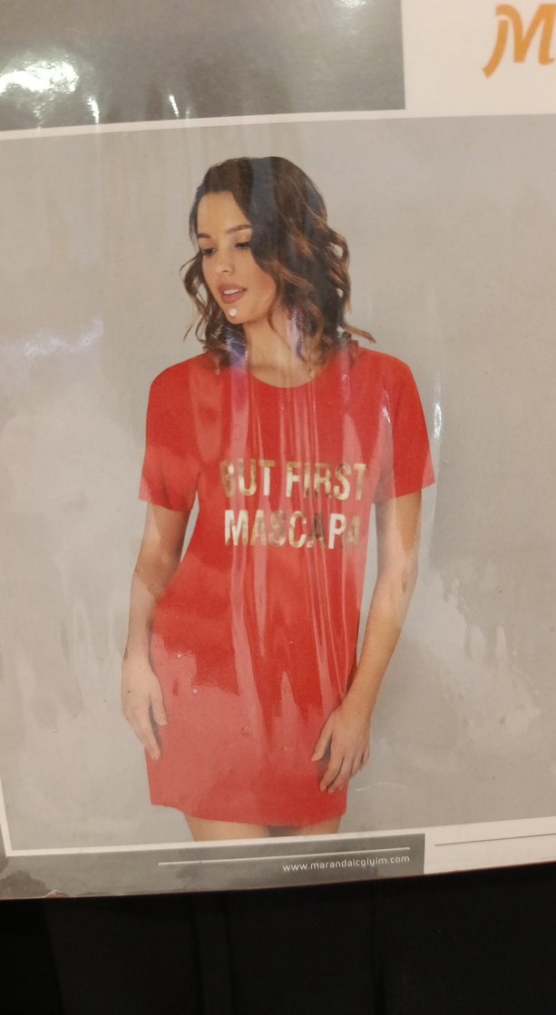 Kısa kollu, midi boy, rahat kesim hamile tişörtü. Parlak, transparan plastikten, 'MASC.P, CUTFIRST' baskılı pop kültür tarzında. Romantik geceye uygun. ❤️