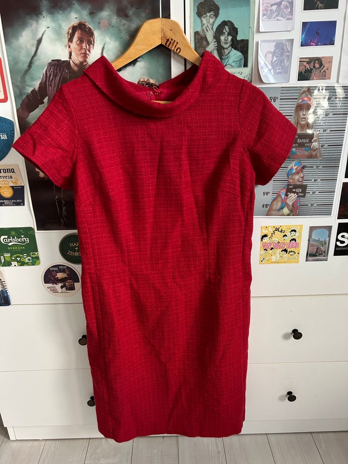 Kısa kollu, yüksek yakalı ve vücuda oturan kırmızı triko elbise. Parlak kırmızı renkte, midi boy ve ofis için uygun vintage 60lar tarzda.