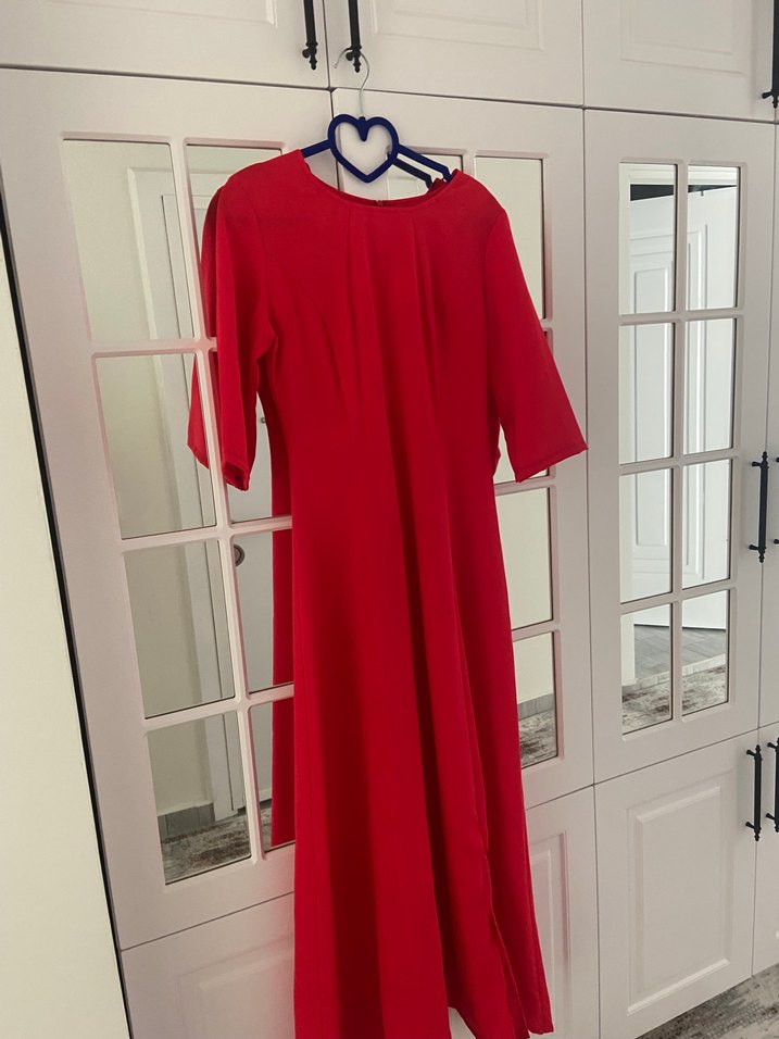 Kısa kollu, V yakalı kırmızı uzun elbise, regular fit ve drapeli tasarıma sahip, ipeksi kumaştan. Modern klasik stil ve romantik geceler için uygundur. Yeni hiç giyilmedi