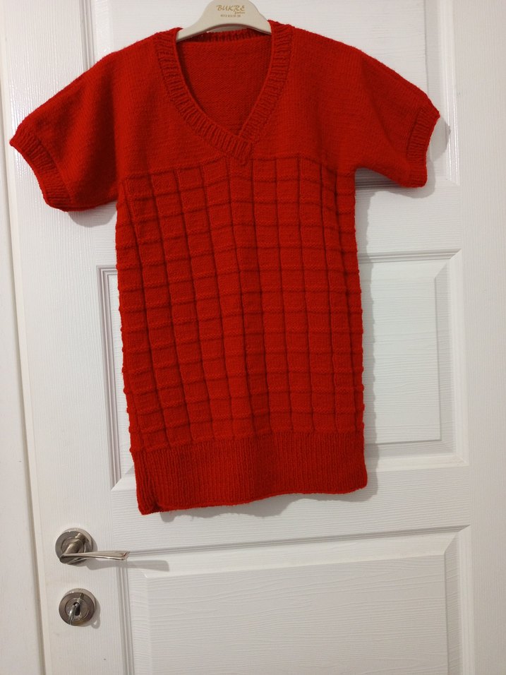 Kısa kollu, V yaka ve fitted kesime sahip kırmızı triko hamile kazağıdır. Orta uzunlukta ve hafif dokulu deseniyle günlük kullanım için uygundur.