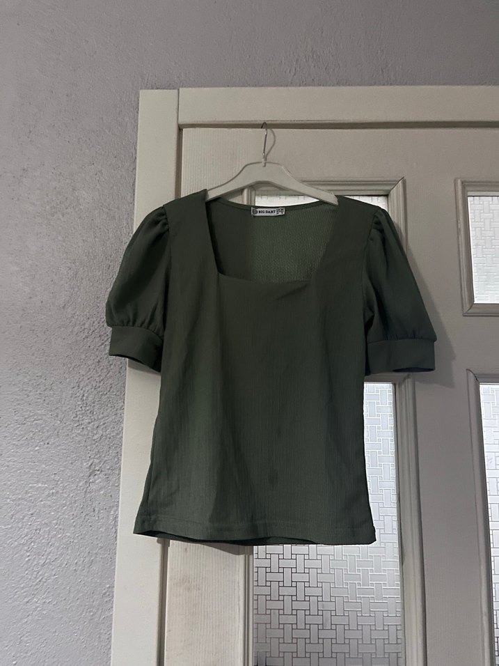 Koyu haki renkte, kısa kollu ve kare yaka tasarımlı keten bluz. Rahat ve bol kesim, sade görünümüyle günlük kullanıma uygun.