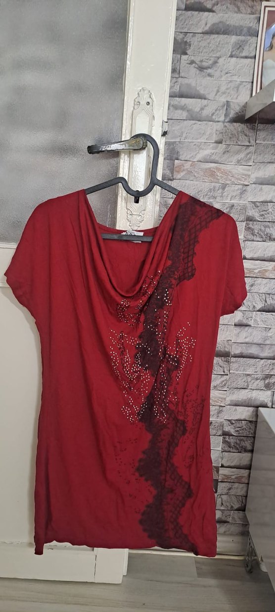 Koyu kırmızı, yakal detaylı kısa kollu ve bol kesim kadın tişörtü. Baskılı ve taş işlemeli tasarımıyla günlük sokak stiline uygun.