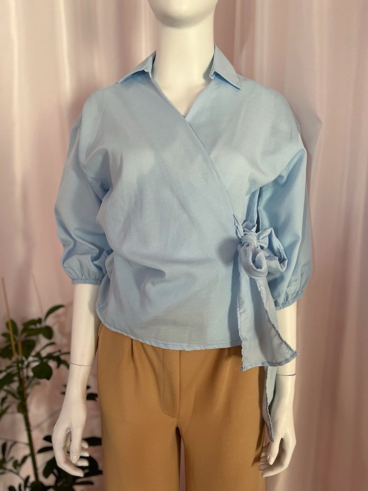 Pamuk kumaştan, kısa kollu, kuşaklı ve yakalı, rahat kesim kadın gömlek. Pastel mavi tonunda, günlük sokak stili için uygun. Swan butikk m ve l beden mevcuttur