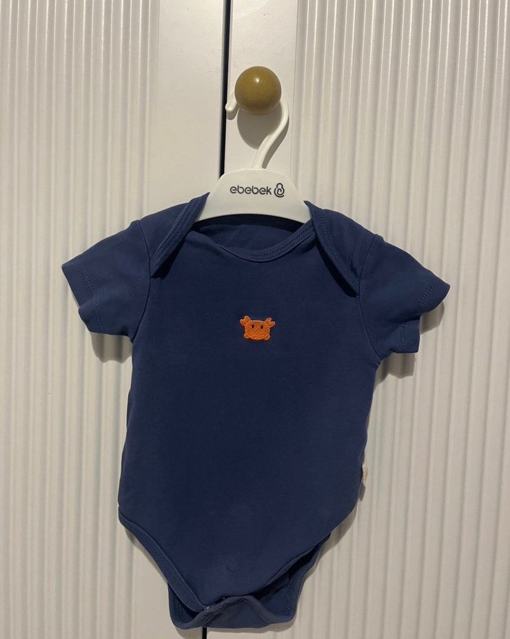 Kısa kollu, yuvarlak yakalı, düğmeli lacivert bebek body. Yumuşak ve sıcak kumaştan üretilmiş, göğsünde turuncu ayı baskısı var. Ohlala koala marka.
