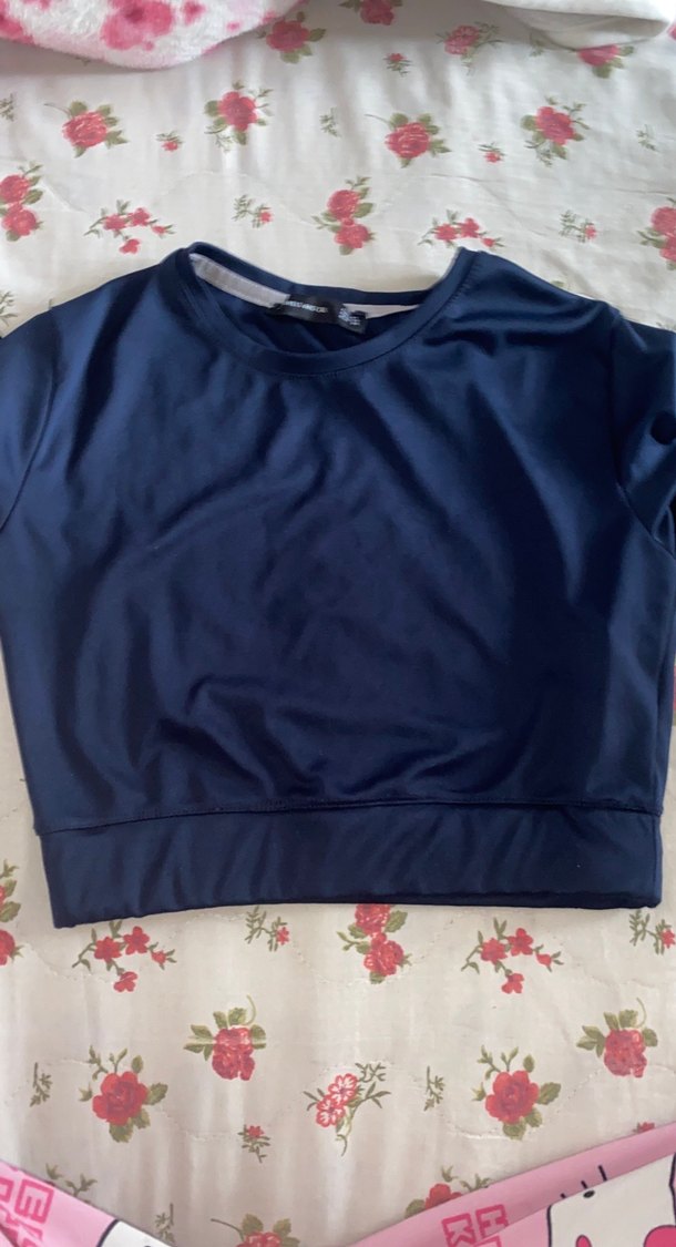 Lacivert kısa kollu, yuvarlak yakalı, vücuda oturan crop top. Pürüzsüz sentetik kumaştan, günlük rahat sokak stili için uygun.