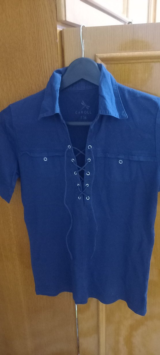 Kısa kollu, dar kesim lacivert denim gömlek, yakalı ve düğmeli ön kısımda bağcıklı detaylıdır, sokak stili için uygundur.