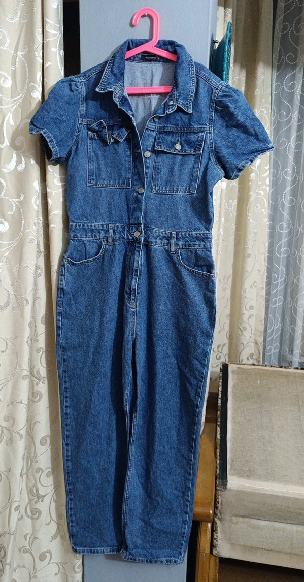 Lacivert denim kumaştan yapılmış, kısa kollu, düğmeli ve yakalı midi uzunlukta tulum. Rahat kesimiyle günlük sokak stiline uygundur.