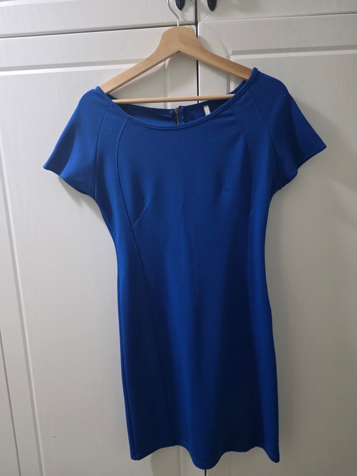 Koyu mavi, kısa kollu, bisiklet yaka, vücuda oturan midi elbise. Düz , şık ve spor kombinlerle uyumlu