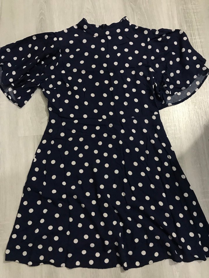 Lacivert puantiyeli, kısa kollu, yüksek yakalı, fırfırlı ve vücuda oturan midi elbise. Yumuşak sentetik kumaştan, bohem ve retro tarzda günlük kullanım için uygun.